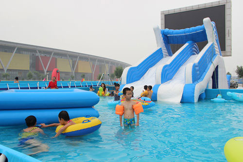 水上樂園的支架游泳池、充氣游泳池因材質(zhì)和構(gòu)造等問題,與固定基礎(chǔ)式游泳池水質(zhì)管理有些區(qū)別。環(huán)繞式布局的循環(huán)過濾凈水系統(tǒng)相對于與固定基礎(chǔ)式游泳池循環(huán)過濾凈水系統(tǒng)的水質(zhì)處理較直觀主動,但需人工輔助,而對固定基礎(chǔ)式游泳池的水質(zhì)管理較大難度。游泳池水質(zhì)處理和游泳池水質(zhì)管理是兩個近似而又所不同的概念,兩個過程是相輔相成的,兩個過程也是同時進行才能夠更好地做好。支架游泳池、充氣游泳池是使用膠膜材料生產(chǎn)的,一般選用淺蘭色材質(zhì)布料作底,水質(zhì)好的時候清澈可見池底細(xì)物,而且水面上泛影著亮瑩瑩淺蘭色波光,讓游客特別是小朋友產(chǎn)生無限的激情與沖動。游客入池游玩時,軟質(zhì)的膠膜布給腳底部一種干凈而舒適的觸覺感,所以膠膜池的顏色與材質(zhì)因素,就給了游客在視覺觸覺上一種非常好的感覺。讓游客及小朋友感覺不僅是游泳,更是一種水上游樂的新體驗。也正是由于顏色與材質(zhì)因素,水質(zhì)的變化通過池體本身也會無形反饋給游客。