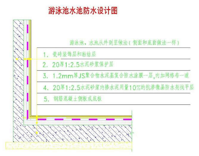 以上就是一個完整的標準的游泳池防水做好了。由于我們國家無建筑防水專業,所以面對游泳池防水設計似乎沒標準可言,很多人設計人員也不知道游泳池里面需要做一道剛性微晶防水層的,只知道做防水涂料,此防水方案是我公司用10多年的建筑結構設計經驗結合對多個游泳池防水設計的跟蹤得出的結果。游泳池防水必須做剛柔結合兩道設防,那樣才是保險的,其實真正起到防水作用的是游泳池的鋼筋混凝土底板和側板,微晶防水剛性層,防水涂料其實是起到輔助防水,但很多設計師也不是很清楚。