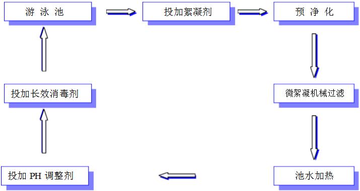 游泳池內(nèi)的水通過池底回水管道,經(jīng)毛發(fā)聚集器。去除毛發(fā)、紙屑、雜草及大塊顆粒狀雜物,再有加藥裝置加入混凝劑,經(jīng)循環(huán)水泵的葉輪攪拌混合后進(jìn)入過濾器,利用過濾器內(nèi)的濾料濾去懸浮物,過濾后的水再經(jīng)消毒處理(冬季循環(huán)水需經(jīng)換熱器加熱),使之達(dá)到國家規(guī)定的游泳池水質(zhì)標(biāo)準(zhǔn)后,送回游泳池再使用。游泳池水就這樣連續(xù)不斷地進(jìn)行著凈化處理,再使用再凈化的循環(huán)過程。