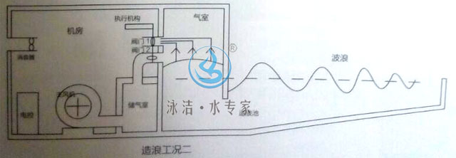 2)電控系統發信號給執行機構,執行機構控制組合閥門機構。閥門打開,風從蓄壓室進入氣室,壓迫氣室內水面下降,水從氣室內排除,壓出水形成波峰。
