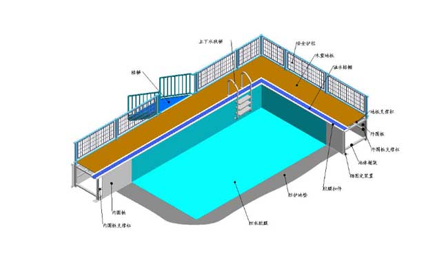 泳池池體采用碳鋼Q-235熱軋鋼框架結構,高強度螺栓緊固鏈接。特殊結構的鋼框架及鋼制溢水槽表明均采用熱鍍鋅防腐處理,可以長年至于室外不易銹蝕變形。泳池內圍板采用規格為240×30mm PVC中空板,拉伸強度≥35MPa;彎曲強度≥65MPa。泳池內襯采用PVC夾網防水泳池專用膠膜,厚度為0.7-0.9mm。池底防護墊采用5mm化學交聯材質,使泳池膠膜與地面分隔開起到保護膠膜的作用。池體四周鋪制防滑木塑地板。